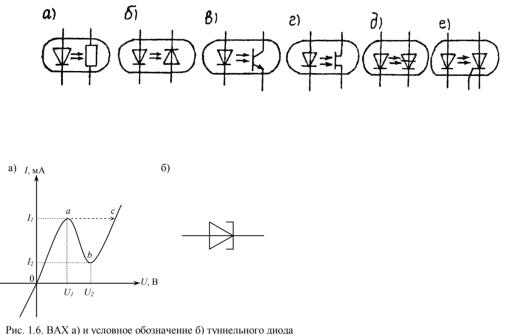 Различные типы оптронов приведены на рис.1.4.5: а – резисторный, б – диодный, в– транзисторный (биполярный), г – транзисторный (полевой), д – динисторный, е – тиристорный и т.д.