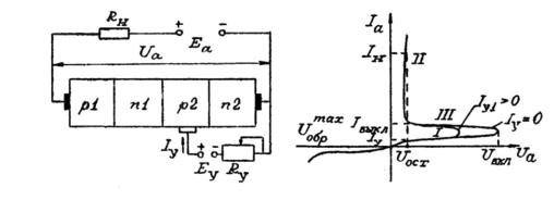 Построение выполнено для трех значений тока управления Iу1> Iу= 0. Обратная ветвь вольт–амперной характеристики тиристора аналогична обратной ветви вольт– амперной характеристики полупроводникового диода и не зависит от тока управления Iу. При прямом анодном напряжении Uпр вольт–амперная характеристика имеет две резко отличающиеся области. Одна из них соответствует запертому состоянию тиристора (горизонтальный участок характеристики), в котором его анодный ток очень мал (измеряется единицами или долями миллиампера), из за чего все