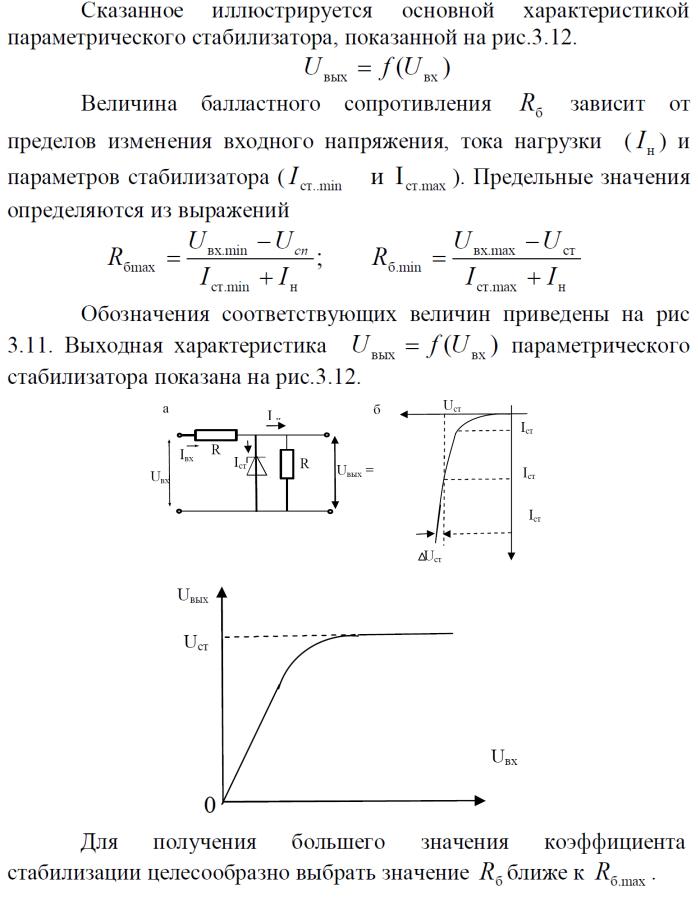 УПТ (VT2) и к соответствующему уменьшению падения напряжения на резисторах R1 и R2. Напряжение Uкб транзистора VT1 уменьшается, VT1 подзапирается, его сопротивление увеличивается. Возникшее увеличение Uвых компенсируется повышением падения напряжения на VT1. В результате этого выходное напряжение стабилизатора возвращается к исходному значению. Чем выше коэффициент усиления по напряжению УПТ, тем точнее поддерживается уровень выходного напряжения и повышается скорость его восстановления. Если коэффициент усиления УПТ стремится к бесконечности, то выходное напряжение стабилизатора полностью определится коэффициентом передачи делителя напряжения на резисторах R4, R5, R6 и значением опорного (эталонного) напряжения Uоп. При перемещении движка потенциометра R5 в нижнее по схеме положение разница между опорным напряжением и напряжением, снимаемым с делителя, становится большим, базовый и коллекторный токи VT2 увеличиваются, падение напряжений на R1 и R2 увеличиваются. В результате падение напряжения на VT1 снижается, а выходное напряжение возрастает до нового заданного уровня. Так плавно можно изменять величину стабилизируемого напряжения Uвых..__