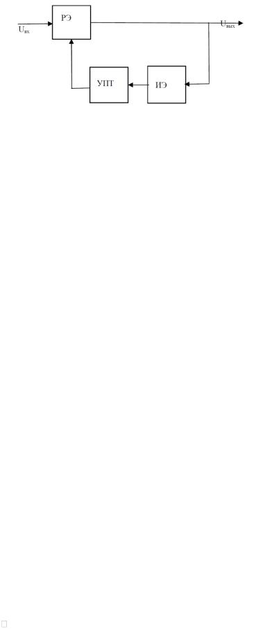 Компенсационный стабилизатор представляет собой простейшую автоматическую систему регулирования, работающую на принципе отрицательной обратной связи (ООС). Для реализации такого принципа устройство, кроме регулирующего (исполнительного) элемента (РЭ) должно содержать измерительный элемент (ИЭ), включающий в себя резистивный делитель. Элемент сравнения, источник эталонного напряжения Uэт , и усилитель постоянного тока УПТ (см. рис.3.13).