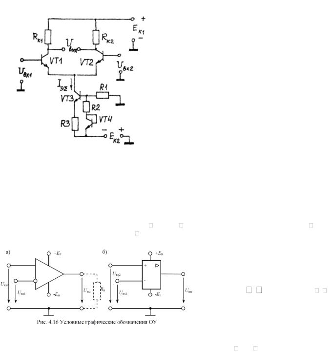 верхние плечи которого образуют резисторы Rк1 иRк2, а нижние – транзисторы VТ1 и VТ2. Рабочая точка транзисторов обеспечивается источником питания Ек2, благодаря которому на эмиттеры транзисторов подан минус, т. е. на базы подан плюс. Транзистор VТ3, резисторы R1, R2, R3 и транзистор VТ4 в данном включении образуют источник стабильного тока. В подобных схемах часто один вход заземляют, а входной сигнал подают на другой вход. Если подать, например, на вход VТ1 положительный сигнал, VТ1 откроется, его ток эмиттера увеличится, а, поскольку общий ток эмиттеров Iэ=const, ток транзистора VТ2 Iэ2