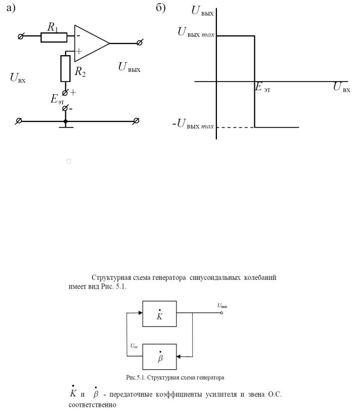 ) напряжение между нвертирующим и неинвертирующим входами достигнет нулевого уровня, когда уровень и полярность входного напряжения будут в точности равны параметрам эталонного напряжения. В этот момент произойдет срабатывание компаратора, на выходе вместо +Uвых max получаем -Uвых max. Напряжение Eэт называют порогом срабатывания
