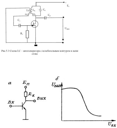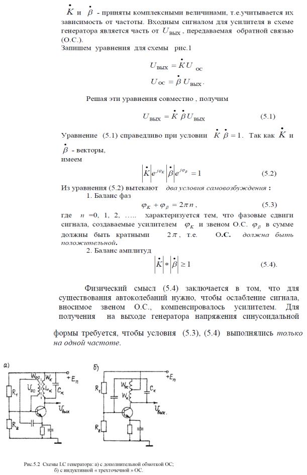 зависимой нагрузкой в виде колебательного LC – контура. Условия для генерации колебаний (баланса фаз и амплитуд) создаются для частоты настройки f o=1/2П LC параллельного колебательного контура, когда его сопротивление является активным и минимальным из величин. Схема простейшего генератора показана на рис. 5.4 Положительная ОС осуществляется за счет обмотки Wос. Фаза напряжения Uос подбирается выбором начала