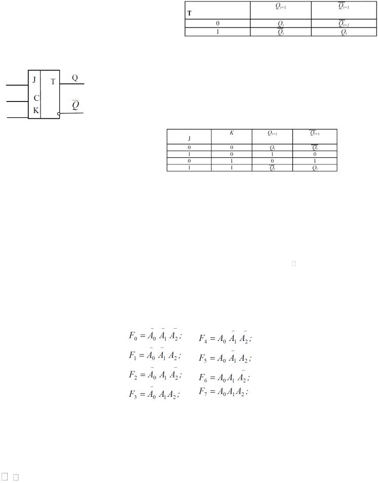 Т-триггер. Т-триггер имеет один управляющий счетный вход (Т) и два выхода (Q и Q) (рис. 7.9). Информация на выходе триггера меняет свое значение на противоположное при каждом перепаде напряжения на входе. Таблица истинности представлена в табл. 7.3.