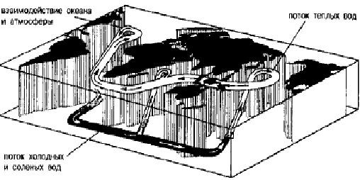Схема межокеанского обмена представлена на (рис.1). На схеме видно, как в поверхностных слоях идет поток теплых вод из Тихого и Индийского океанов в субполярные районы Северной Атлантики. Процессы взаимодействия между океаном и атмосферой приводят к охлаждению воды и ее погружению в глубь океана, а также формированию водных масс: промежуточной Лабрадорской и глубинной Северо-Атлантической. Они и образуют поток холодных вод, движущийся в противоположном направлении.
