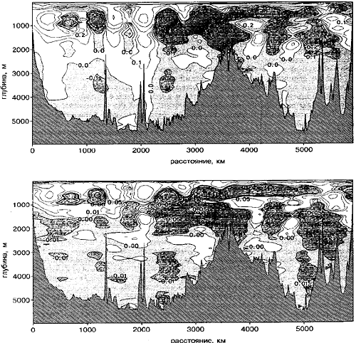 Великая соленостная аномалия имела и другие последствия. Поскольку меридиональный обмен вод через субполярный фронт в Северной Атлантике ослаб, уменьшились поступление тепла и его отдача в атмосферу в высоких широтах. Именно с 1977 г. отмечается начало последнего понижения температуры в Северном Ледовитом океане (вопреки результатам моделирования при учете роста концентрации двуокиси углерода в атмосфере). А что же в это время происходило в глубинах океана?