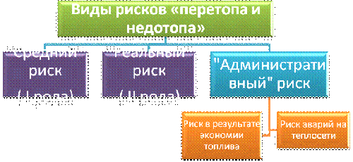 - «Перетоп или недотоп» также может возникать вследствие «желания» экономить топливо (в некоторых случаях в связи с административным ограничение транша на закупку топлива), назовем это - «административным» риском. Последние виды риска могут быть рассчитаны только в результате анализа графиков подачи тепла, которые должны храниться.