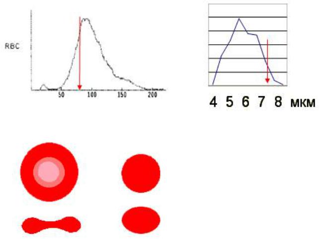 Стрелкой отмечен нормальные: средний объём эритроцитов (слева) и диаметр (справа)