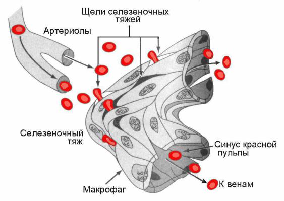Схема прохождения эритроцитов нормальной формы через красную пульпу селезёнки