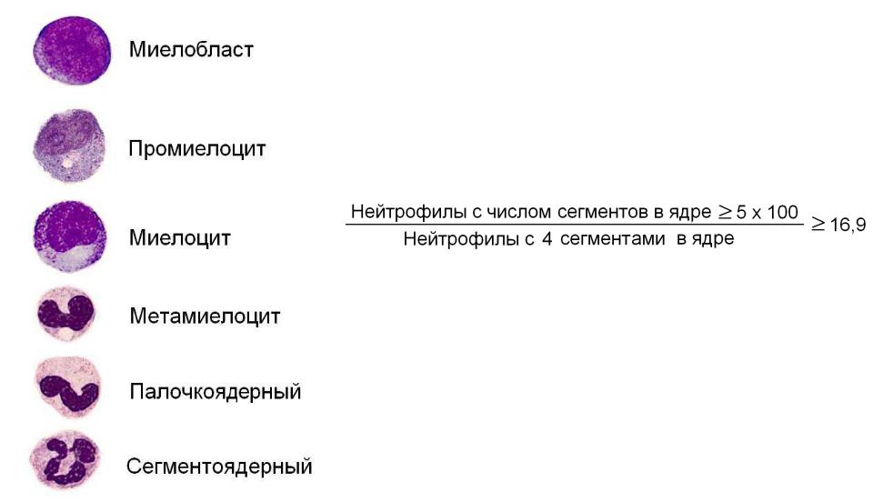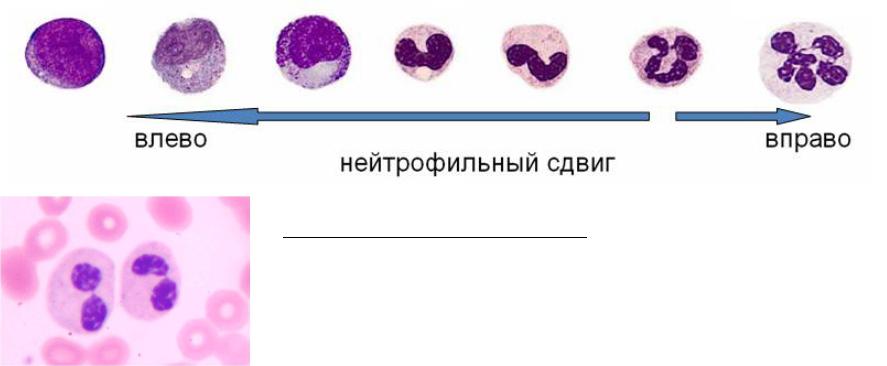 Нейтрофильный сдвиг вправо – это увеличение количества сегментов в ядре. Критерий сдвига вправо: на 100 нейтрофилов 3 клеток с 5 сегментами в ядре или хотя бы один нейтрофил с 6 сегментами.