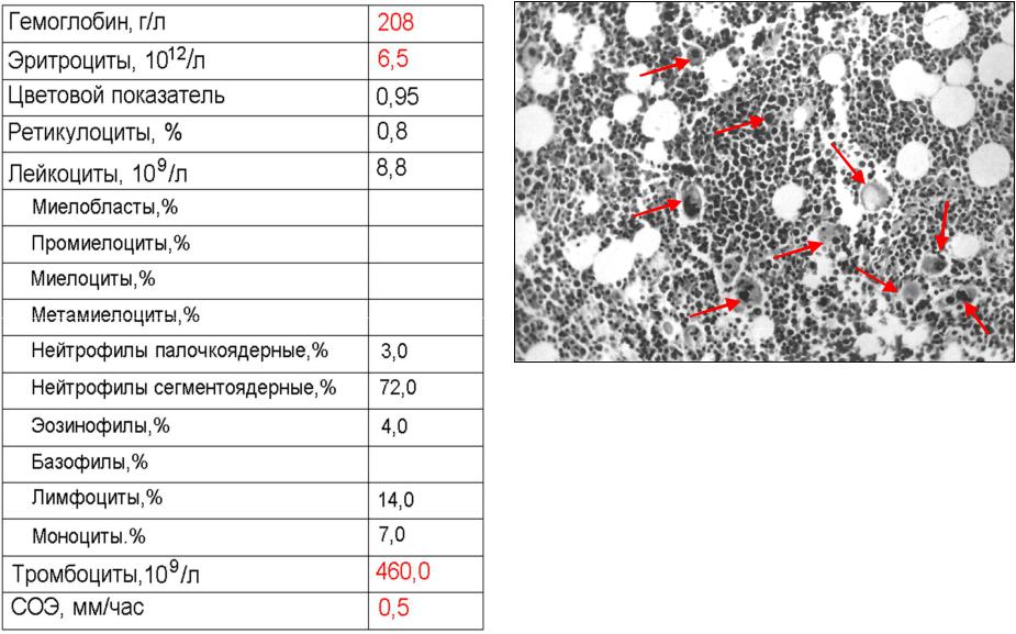 Трепанобиоптат подвздошнойкости: уменьшено количество жира, обилие мегакариоцитов (показаны стрелками)