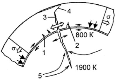 1 − образование зародыша трещины на свежей поверхности; 2 − раскрытие зародыша трещины в результате коррозионного растрескивания; 3 − распространение трещины; 4 − конечное пластическое разрушение; 5 − выделение охрупчивающих продуктов деления