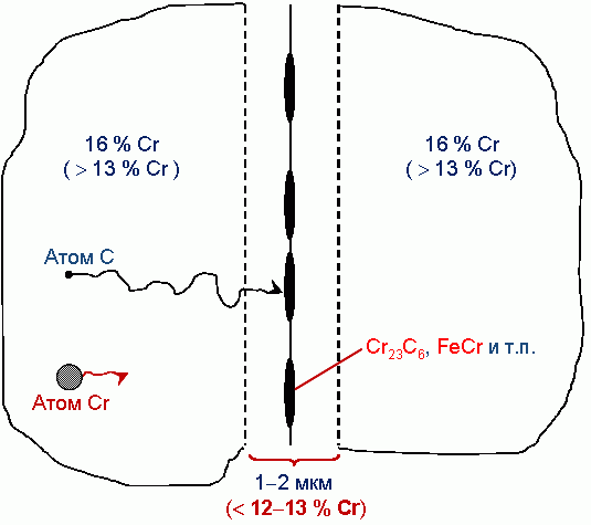 При Т примерно 600 °C углерод взаимодействует с Cr на границах зерен и образуется Cr23C6=>обеднение границ хромом, что вызывает интеркристаллитную коррозию (т.е. образование оксидов на границах).