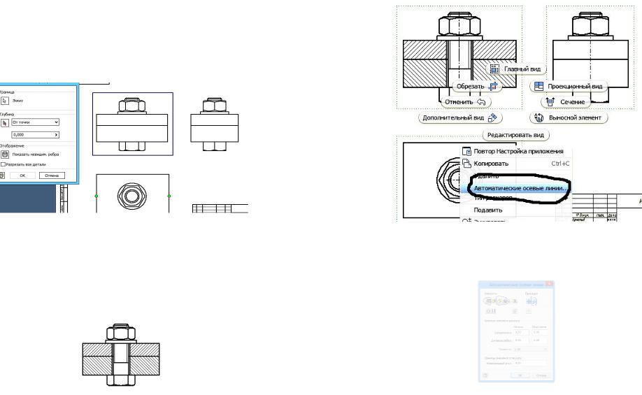 14.Для оформления чертежа перейдите на вкладку «Пояснение (ESKD)». Выберите три вида чертежа. Для этого во время процедуры выбора удерживайте нажатой клавишу «SHIFT» или «CTRL», затем щелкните правой кнопкой мыши и выберите в контекстном меню пункт «Автоматические осевые линии» (рис. 4.103).