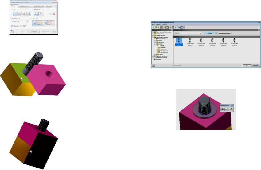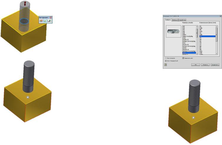 14.Разместите гайку так чтобы, подсветилась верхняя кромка отверстия шайбы и щелкните ЛКМ. В окне «Авторазмещение» нажмите кнопку