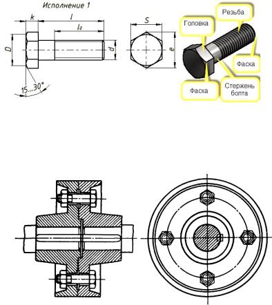 Болт представляет собой цилиндрический стержень с головкой на одном конце и винтовой резьбой на другом (рис. 1.17). Обычно болты применяют для скрепления (соединения) деталей не очень большой толщины, фланцев (рис. 1.18), при необходимости частого соединения и разъединения деталей.