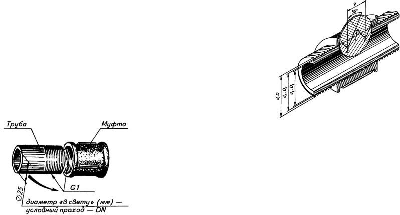 Трубная цилиндрическая резьба по ГОСТ 6357–81 (рис.1.10) применяется на водогазопроводных трубах, деталях для их соединения (муфтах, угольниках, тройниках и т.д.), трубопроводной арматуре (вентилях, клапанах, задвижках и т.д.).