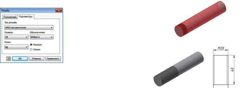 Вокне «На всю длину» уберем галочку и введем в окне «Длина» 40 мм. Длина резьбы на стержне изменится на 40 мм. Нажмите на кнопку «Применить» (рис. 2.5.).