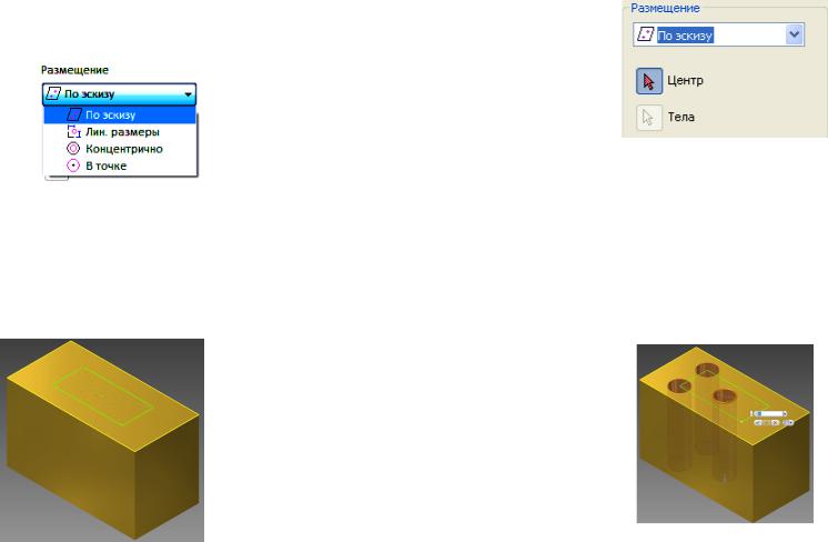 Размещение отверстий на модели объекта реализуется несколькими способами: «По эскизу», «По линейным размерам» относительно выбранных ребер объекта, «Концентрично» существующему объекту и «В точке».