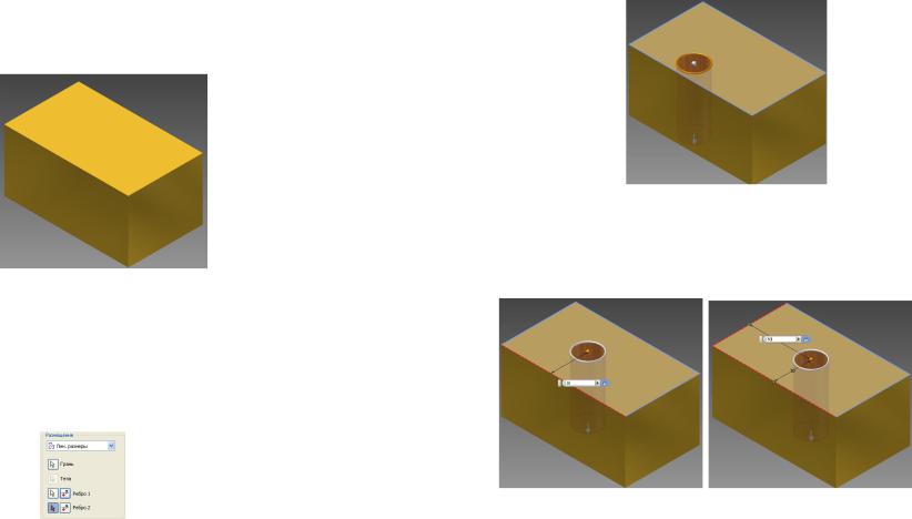 Выберите два линейных ребра для указания центра отверстия. Выберите первое боковое ребро. В появляющемся размерном окне введите нужное расстояние, например 30 мм. Отверстие займет соответствующее положение относительно выбранного ребра. Укажите второе ребро и введите расстояние 50