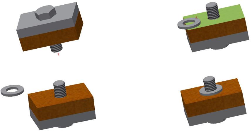 Продолжите сборку болтового соединения. Присоедините к двум скрепляемым платинам последовательно болт, шайбу и гайку.