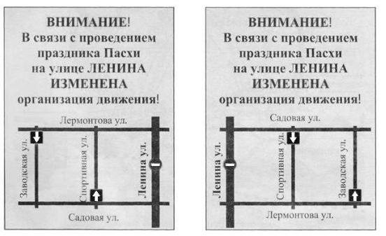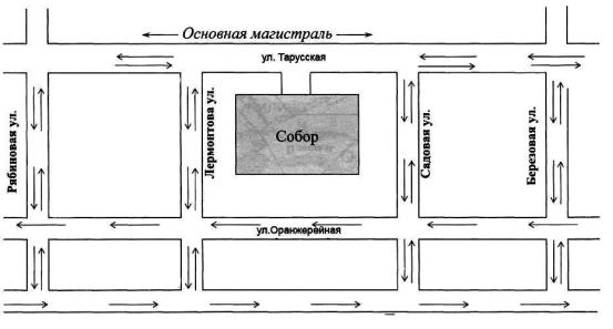 Составляя план-схему организации дорожного движения в период подготовки и проведения массового мероприятия, необходимо вспомнить, что при проведении мероприятий по временному ограничению или запрещению движения на отдельных участках улиц и дорог особое внимание следует уделять информационному обеспечению водителей транспортных средств. Предметом информации в этом случае являются введенные с помощью средств организации дорожного движения ограничения и оптимальные маршруты объезда данных участков. Пример временной схемы организации дорожного движения приведен на рисунке 15.