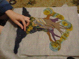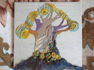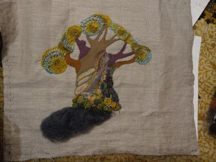 Коллаж в технике фриформ позволяет передать фактурность и движение. Применение различных элементов повышает интерес к работе. Использование ткани, кожи и технологии сухого валяния позволили сосредоточить внимание зрителя на главном - ствол дерева с его разнообразной фактурой.