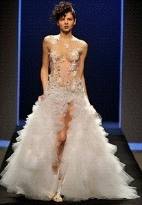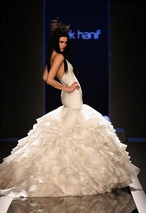 Линии, повторяющие силуэт, переходящие в роскошную юбку принцессы - это вызов молодого турецкого дизайнера Дилека Ханифа (Dilek Hanif). Эта модель - смелое смешение стилей, результатом которого стали гламур и шик! Кристоф Жосс (Christophe Josse) проводит ассоциацию между плотной и объемной юбкой из тюля и легкостью лифа, который скрывает тело фрагментами ткани. Наряд не прячет силуэт невесты, а раскрывает её красоту.