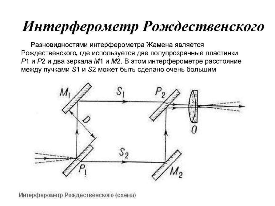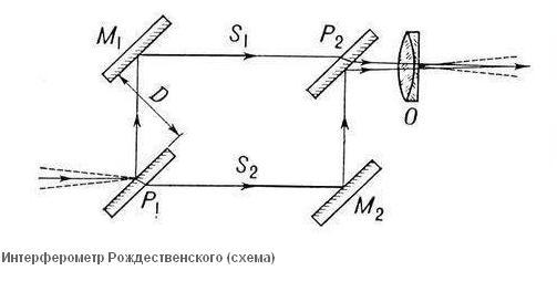 Интерферометр Рождественского. Разновидностями интерферометра Жамена является Рождественского, где используется две полупрозрачные пластинки P1 и P2 и два зеркала M1 и M2. В этом интерферометре расстояние между пучками S1 и S2 может быть сделано очень большим.