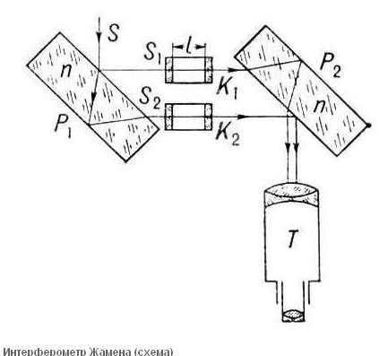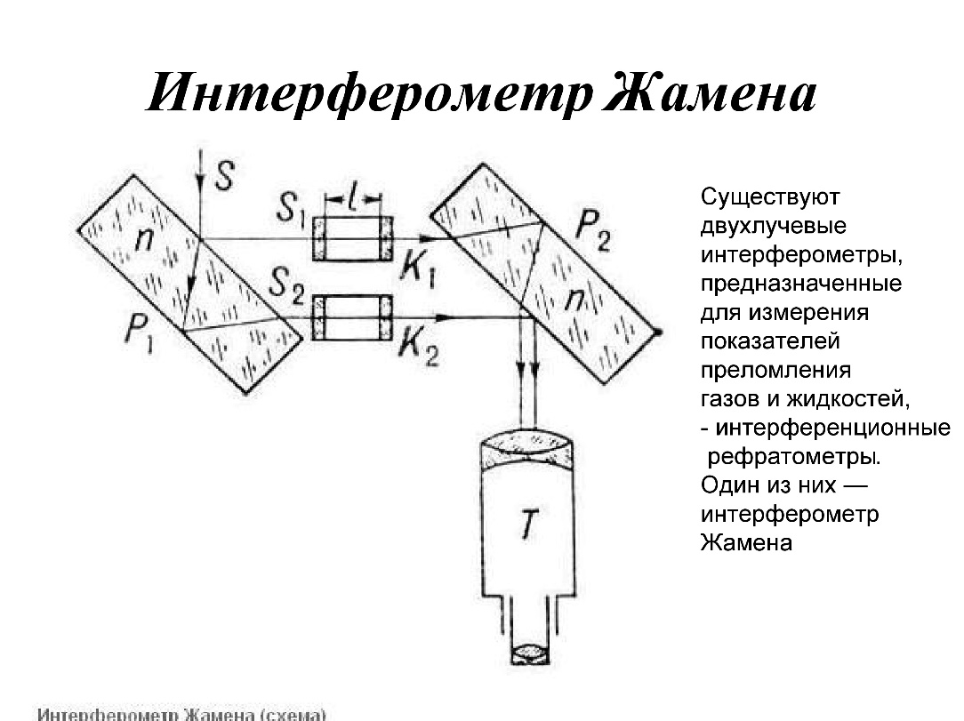 Существуют двухлучевые интерферометры, предназначенные для измерения показателей преломления газов и жидкостей, - интерференционные рефратометры. Один из них — интерферометр Жамена