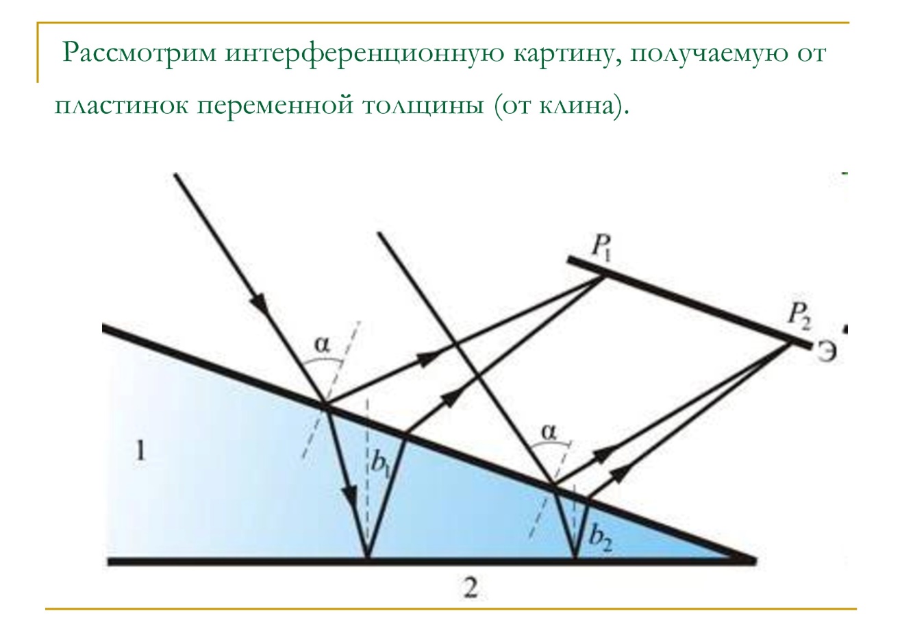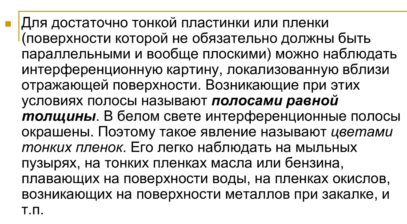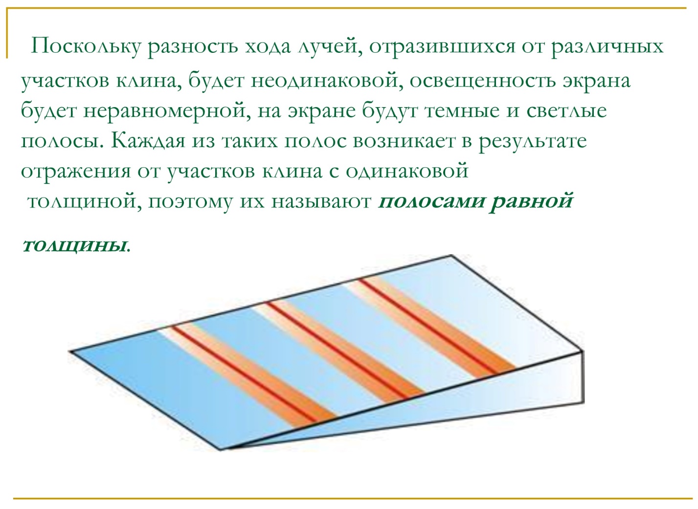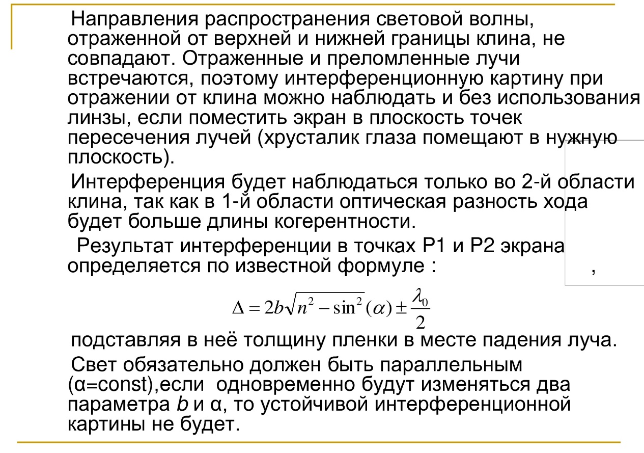 2) полосы равной толщины (интерференция от пластинки переменной толщины;