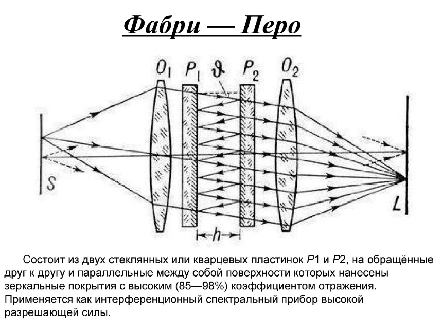Состоит из двух стеклянных или кварцевых пластинок P1 и P2, на обращённые друг к другу и параллельные между собой поверхности которых нанесены зеркальные покрытия с высоким (85—98%) коэффициентом отражения. Применяется как интерференционный спектральный прибор высокой разрешающей силы. Применение интерференции По интерференционной картине можно выявлять и измерять неоднородности среды (в т.ч. фазовые), в которой распространяются волны, или отклонения формы поверхности от заданной.