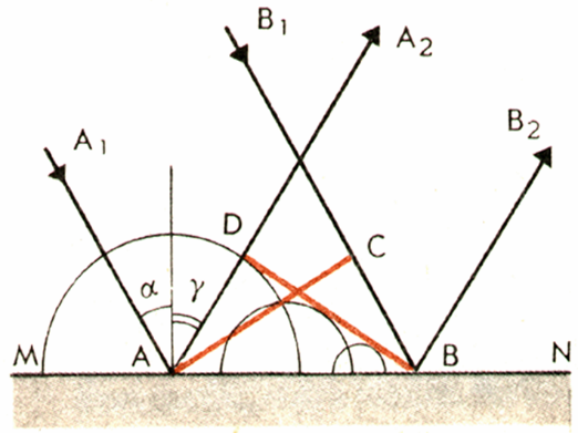 Фронт отраженной волны BD образует такой же угол с плоскостью раздела двух сред, что и фронт падающей волны AC.