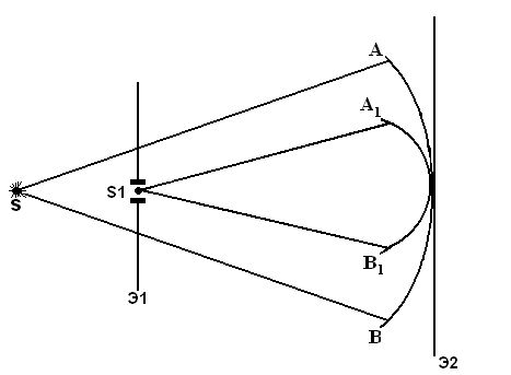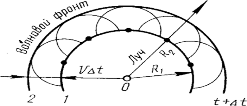 Согласно принципу Гюйгенса, каждая точка этой границы сама становится источником сферических волн.