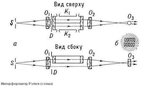 В интерферометре Рэлея интерферирующие пучки выделяются с помощью двух щелевых диафрагм D.