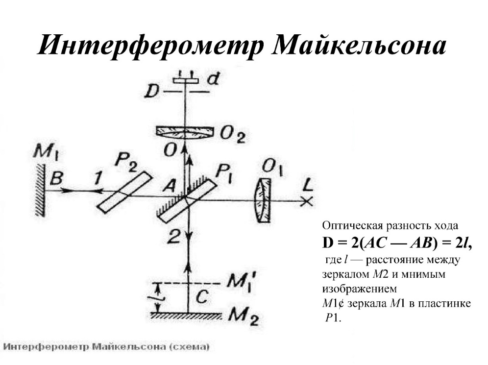 зеркалом M2 и мнимым изображением M1¢ зеркала M1 в пластинке P1. Интерферометр Жамена