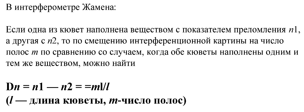 Если одна из кювет наполнена веществом с показателем преломления n1, а другая с n2, то по смещению интерференционной картины на число полос m по сравнению со случаем, когда обе кюветы наполнены одним и тем же веществом, можно найти