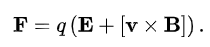 F-сила [Н], q-заряд [Кл], E-напряжённость эл.поля [Н/Кл], v-скорость [м/с], B-магнитная индукция [Тл]
