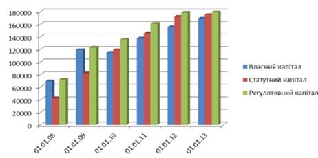 Зростання банківського капіталу відбулося в основному в результаті збільшення сплаченого зареєстрованого статутного капіталу, який зріс з 42 873 млрд. грн. у 2008 році до 175 204 млрд. грн. на початок 2013 року. Однак розмір власного капіталу й надалі залишається меншим за статутний капітал. Це можна пояснити значними збитками банківської системи України у попередні роки. Розмір регулятивного капіталу протягом аналізованого періоду зріс у 2,4 рази, втім порівняно з 2008-2012 роками темп його зростання значно знизився, але на відміну від власного капіталу банків його розмір перевищує статутний капітал банківської системи [46] [52].