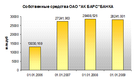 По итогам 2007 года объем собственного капитала «АК БАРС» Банка составил 28.5 млрд. руб., таким образом, прирост составил 4,6 %. При этом норматив достаточности капитала Банка (Н1) был равен 17.1%. Этот результат выше, чем значение данного показателя по банковской системе РФ в целом (15.5% на 1 января 2008 года) и по 30 крупнейшим банкам в частности (14.3%).