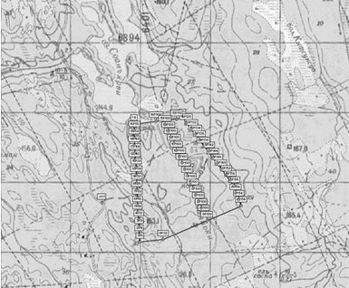 Разбивка сети магистралей и выходов профилей на магистрали выполнялась при помощи спутниковых GPS навигаторов (Garmin 60Sсх, Garmin 62) и мерных лент (длиной 20м.) в соответствии с масштабом проводимых работ. Разбивка по буссоли сети профилей проводилась без рубки леса, с установкой пикетов и маркировкой профилей специальной лентой. Пикеты расставлялись по сети 100 х 20 м, что соответствует геофизической съемке масштаба 1: 10 000. Привязка начала и конца профилей а так же магистральных пикетов кратных 500 метрам осуществлялась спутниковыми GPS навигаторами.