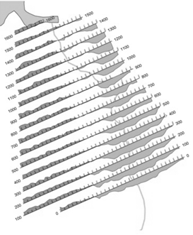 В восточной части участка (ПР 0 - 700) отмечаются две магнитные аномалии, которые в районе ПР 800 соединяются и образуют общую структуру. По своей интенсивности аномалии можно разделить на интенсивные (DТ до 3000 нТл) и слабоинтенсивные (DТ до 800 нТл). Слабоинтенсивные аномалии отмечаются на интервале от ПР0 ПК720 до ПР700 ПК1000 и слагают структуру субмеридионального простирания. Интенсивные аномалии фиксируются на восточном краю участка, с запада граница этой аномальной зоны отмечается в районе ПР 0 ПК 1200 - ПР 1500 ПК 1100, восточная граница находится за пределами изучаемого участка работ. Азимут простирания 3300СЗ. Внутри этой зоны выделяется несколько линейных магнитных аномалий северо-западного простирания.