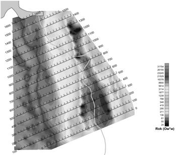 В восточной части участка фиксируется проводящая зона 20-1000 Ом*м, связанная с распространением различных по своему составу сланцев Ялонварской свиты. Понижение сопротивлений до 100 Ом*м и ниже в восточной части участка по всей видимости свидетельствует о присутствие в разрезе углеродистых (проводящих) сланцев.