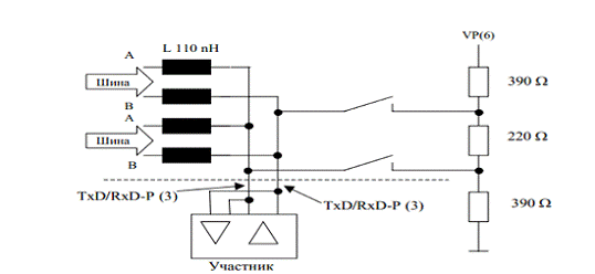 Шинные провода данных с обеих сторон замкнуты на согласованные нагрузки (рис.2.3). Благодаря этим сопротивлениям устанавливается безопасный потенциал покоя на проводах шины, когда участники не обмениваются сообщениями (потенциал покоя между телеграммами). Шинные нагрузки имеются почти во всех стандартных разъемах PROFIBUS и могут быть активизированы с помощью переключателей. Если используется шина со скоростью передачи более 1500 kBit/s, то нужно на основании потребляемой мощности подключенных участников и отраженной мощности использовать шинный штекер с дополнительной индуктивностью.
