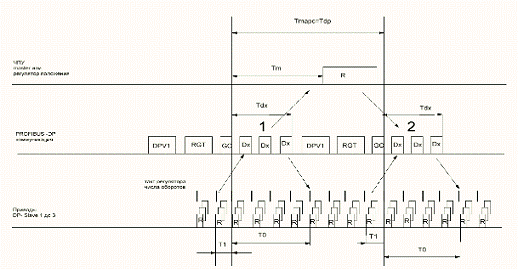 ) Заданные значения - в начале следующего цикла DP во время Tdx заданные значения числа оборотов передаются с DP-Master на DP-Slave(приводы).