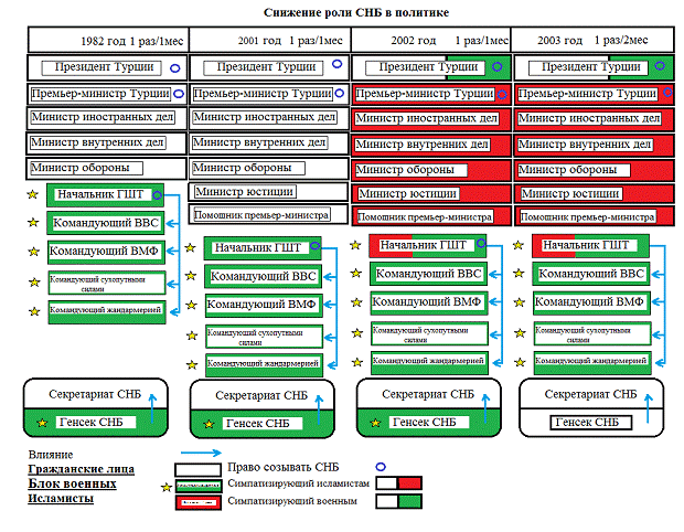 Размах деятельности ПСР действительно впечатляет. Благодаря поправкам в Конституцию 1982 и ряду принятых законов, армия загнана в казармы, а действующий НГШ послушен гражданским властям в лице Р.Т. Эрдогана и А. Гюля. СНБ, являвшийся одним из ключевых органов государства после переворота 1980 года, отошел на второй план, превратившись во второстепенную структуру.