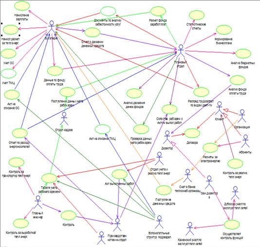 Диаграмма вариантов использования МГУП «Тирастеплоэнерго» описывает всю систему в целом, где рассматриваются работы отдельных подразделений: плановый отдел, бухгалтерия, отдел кадров, отдел учета и реализации тепловой энергии, производственно технический отдел и др.