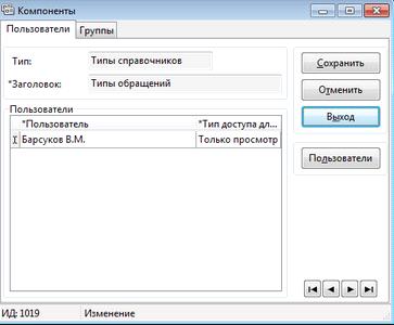 На закладке «Пользователи» указываются типы прав доступа к компоненте для