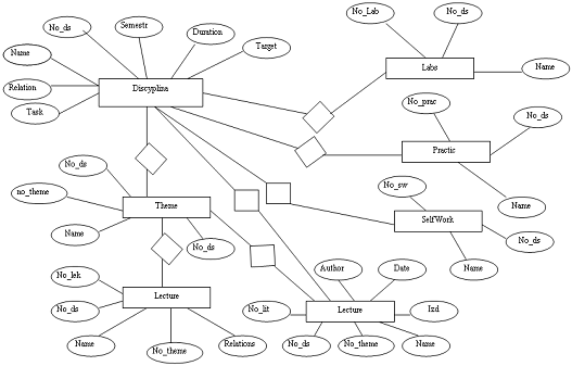 В учебной программе фигурируют такие понятия как: дисциплина, тема, лекция, практические занятия, самостоятельная подготовка студента, используемая литература. Это основные сущности, которые необходимо отразить в базе данных. Связи между этими сущностями можно отразить так, как представлено на рис. 1.1.