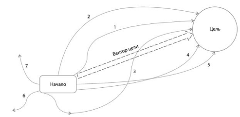 достижения. Достижение цели - это суммарный вектор от точки инициативы до цели